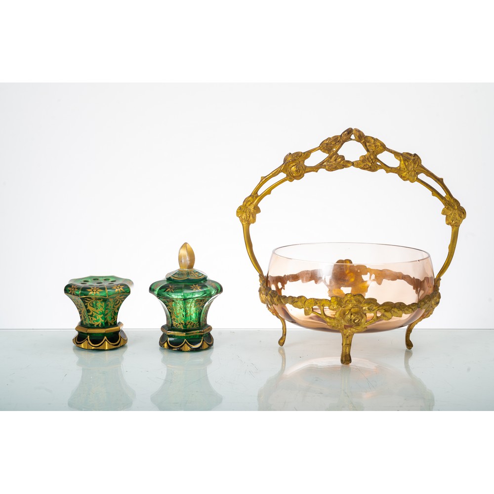 Porta inchiostro e porta pennino in vetro nei toni del verde con lumeggiature in oro e cestino in bronzo dorato con coppa in vetro.