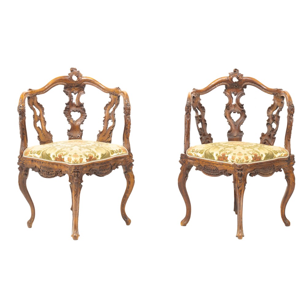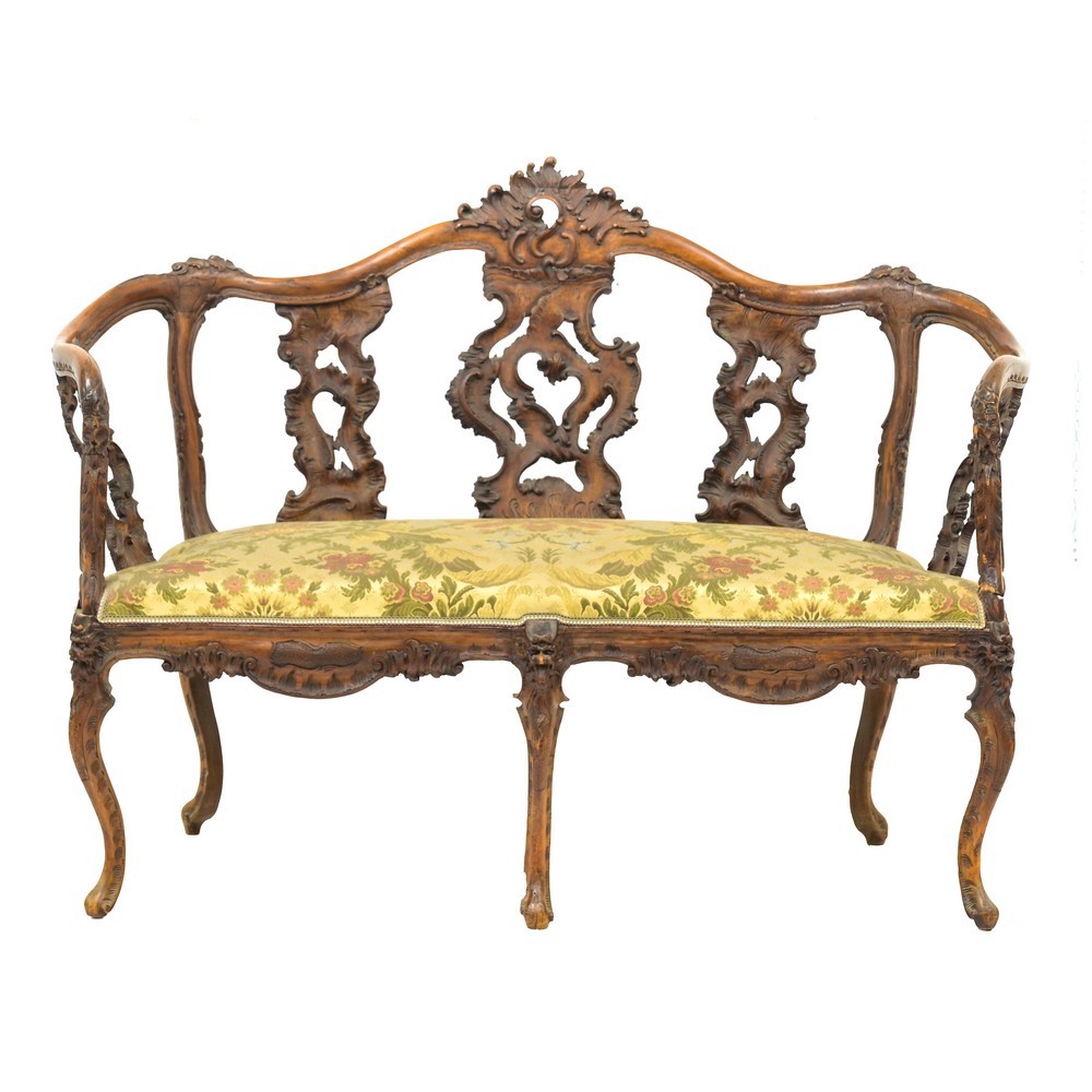 Divano e due poltrone di gusto Barocco in legno di noce.