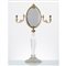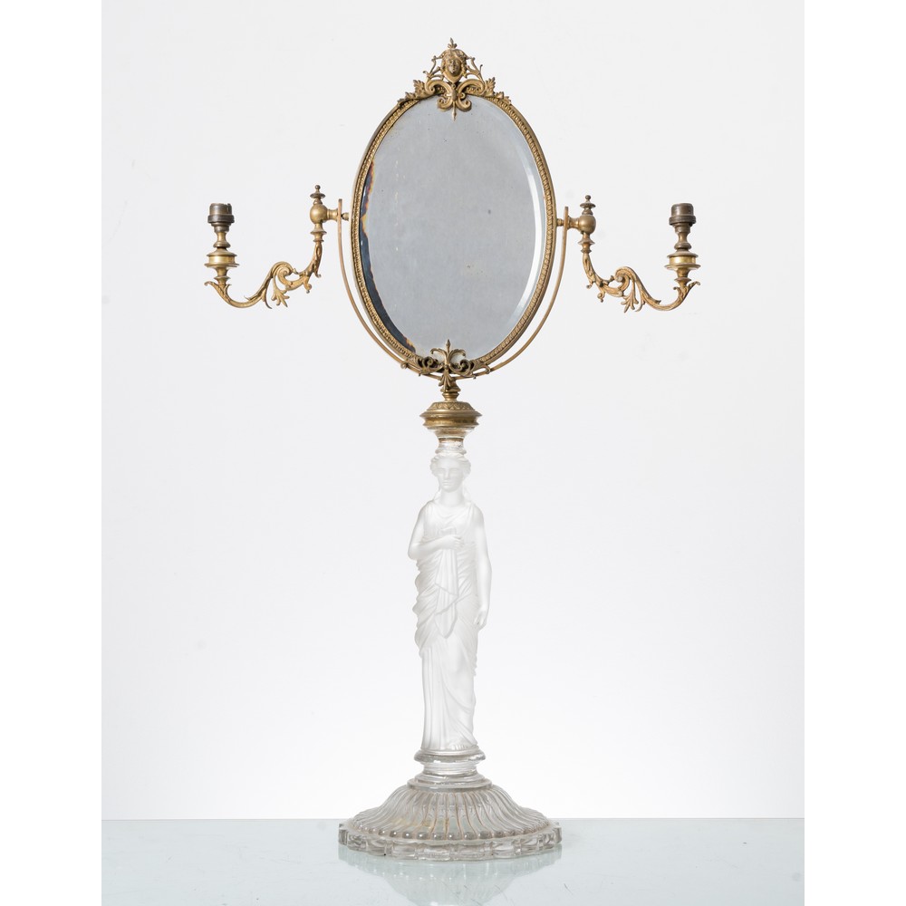 SPECCHIO DA TOLETTA con due candelabri, base in cristallo Lalique raffigurante "Figura femminile".