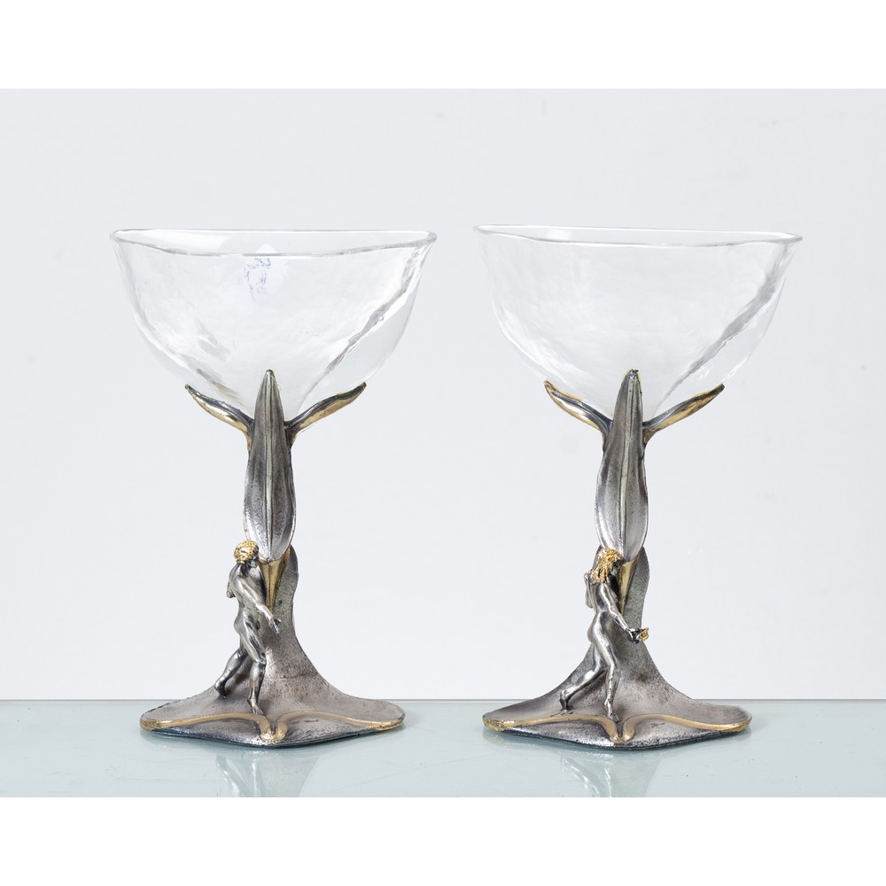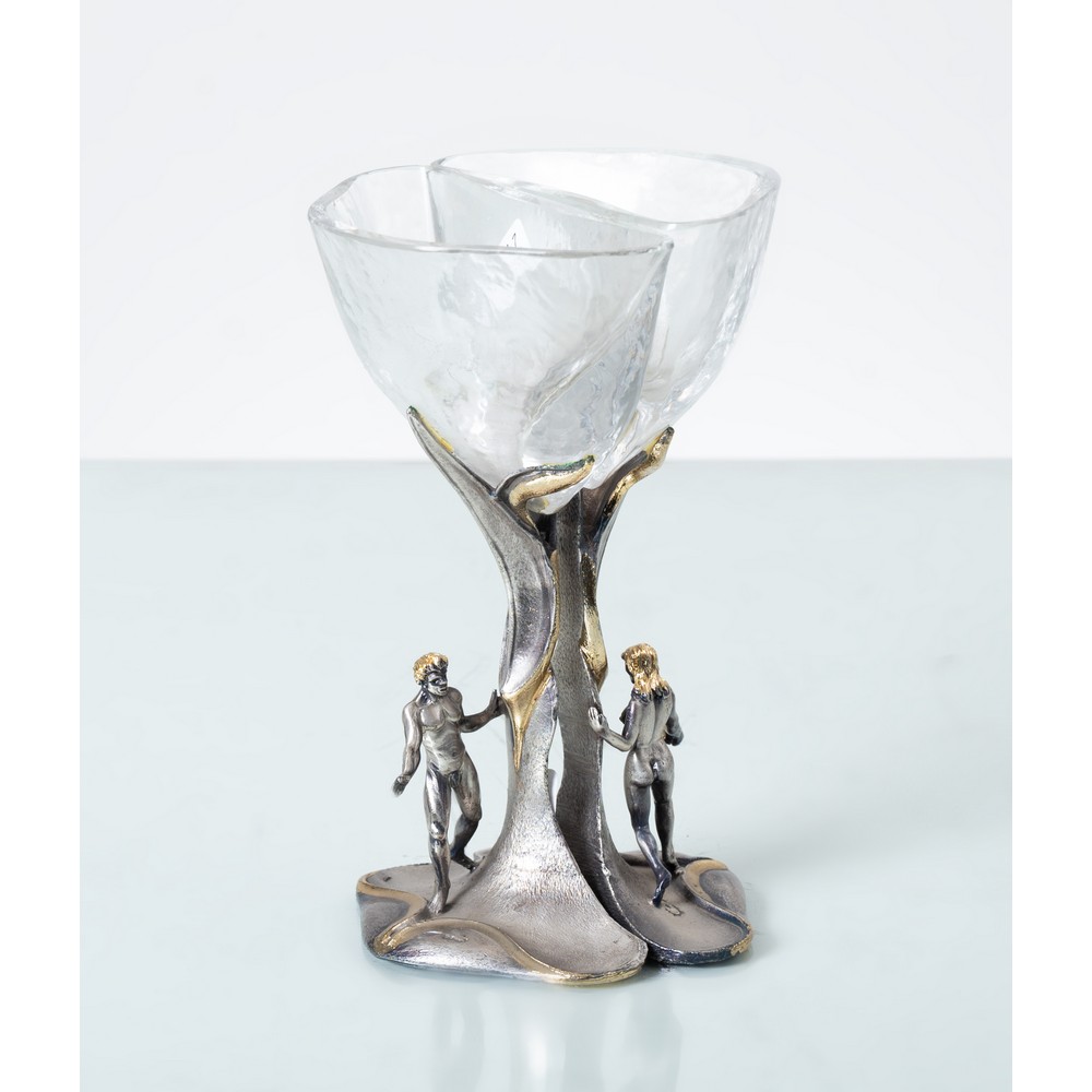 Coppa lui e lei in metallo e vetro con firma in basso.