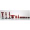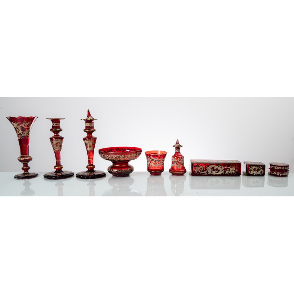 Coppia di monocera, piccolo vaso, bottiglietta porta profumo, tre piccole scatole portagioie e due ciotole in vetro nei toni del bordeaux e decori in oro.
