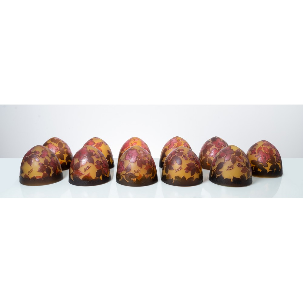 Undici coppe per lumi in vetro lavorato tipo Gallè.