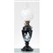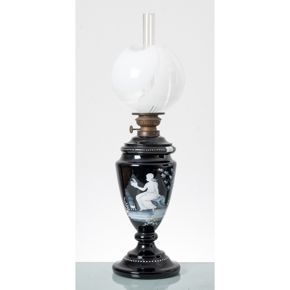 Lume a petrolio in opaline nei toni del nero con decori raffiguranti "Figura neoclassica", tubo e boccia in vetro.