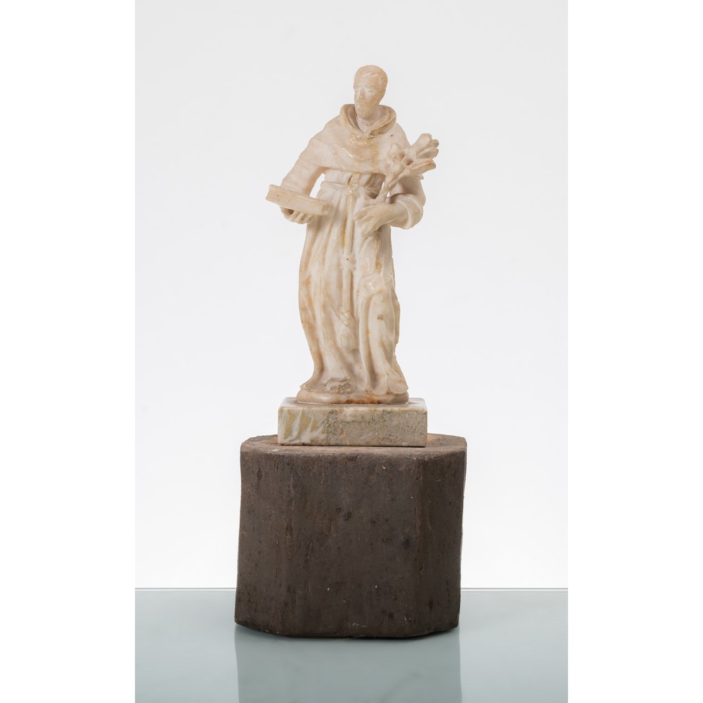 Scultura in alabastro raffigurante "Santo" con base in marmo e supporto in legno (difetti).