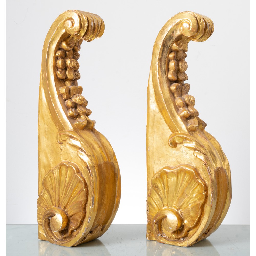 Coppia di elementi in legno scolpito e dorato.