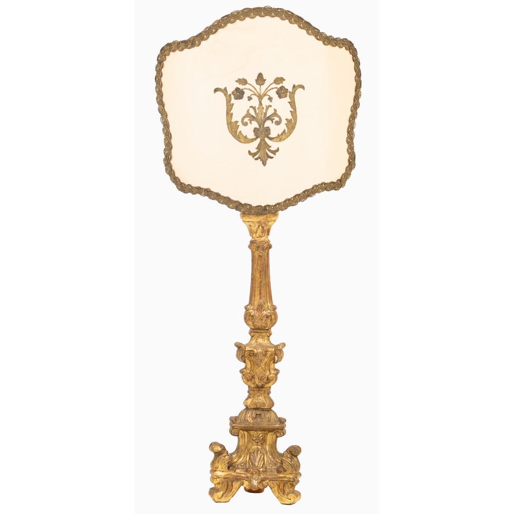 Torciere in legno dorato ad oro zecchino con ventola in tessuto e filigrana dorata (elettrificato).
