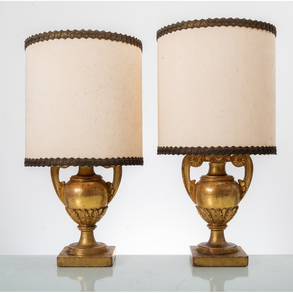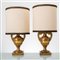 Coppia di pigne in legno dorato con paralumi in tessuto (elettrificati).