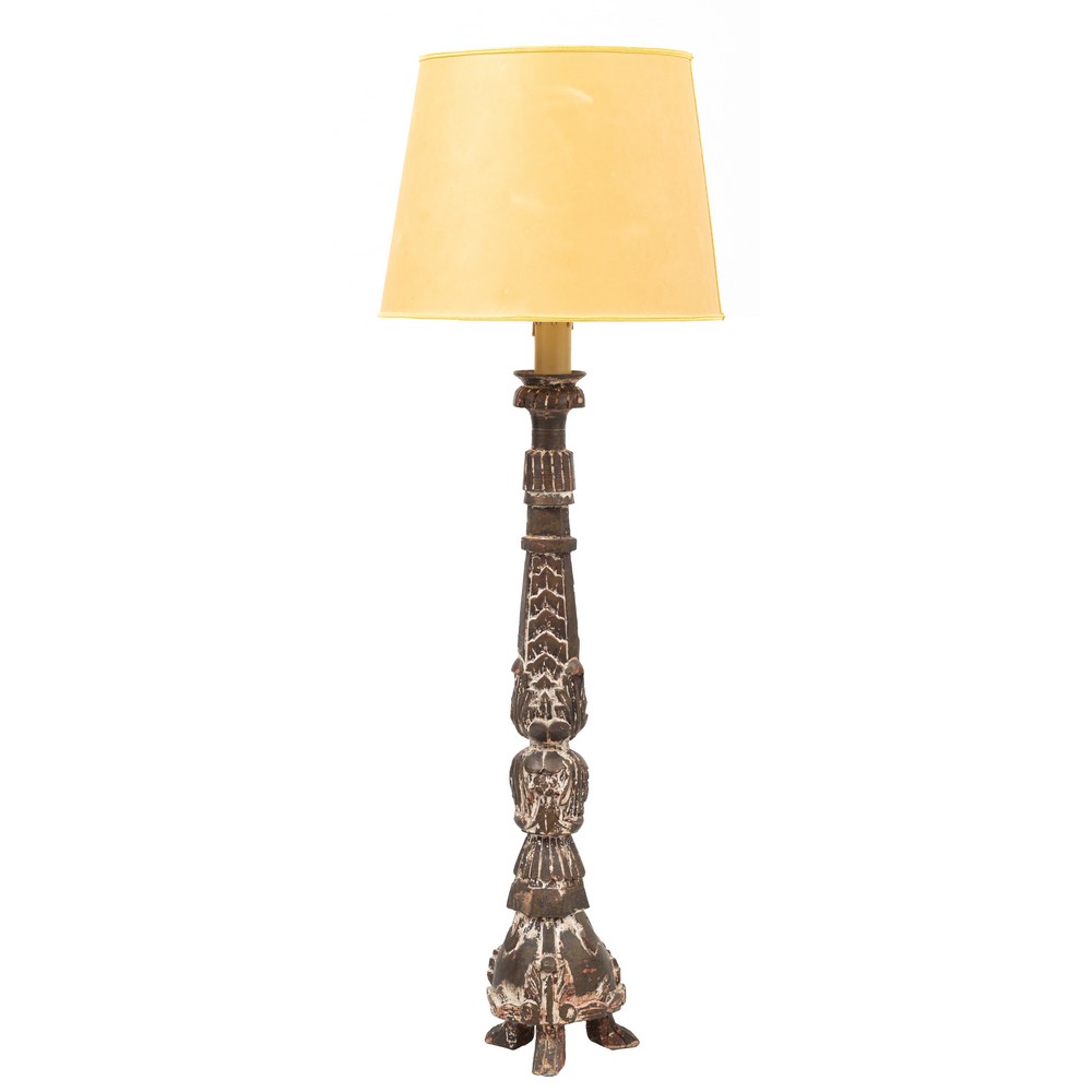 TORCIERE di gusto coloniale in legno laccato con paralume.