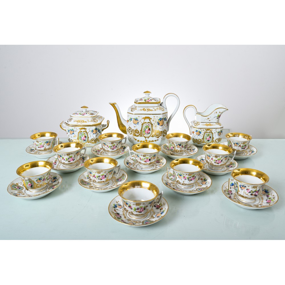 Servizio da tè Luigi Filippo in porcellana decorata e dipinta a motivo floreale con lumeggiature in oro composto da: teiera, lattiera, zuccheriera e 12 tazzine con piattino (usure).