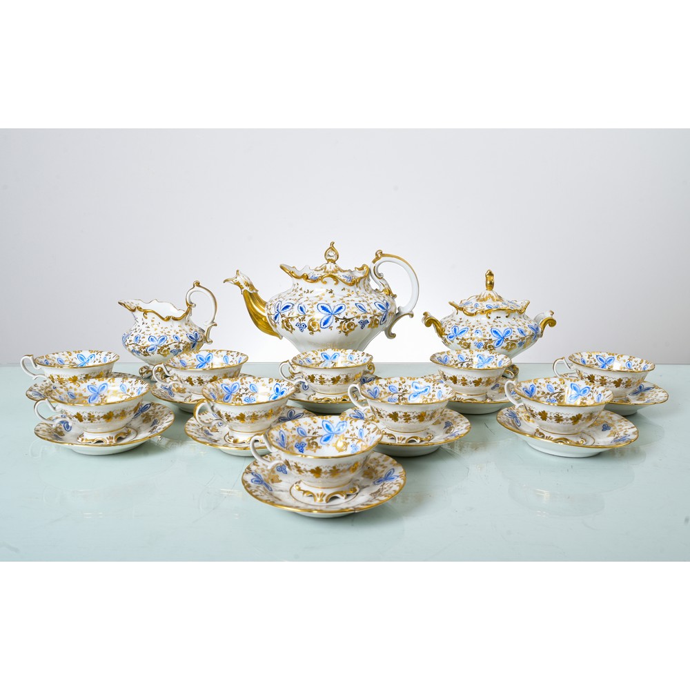 Servizio da tè Luigi Filippo in porcellana decorata e dipinta a motivo floreale con lumeggiature in oro composto da: teiera, lattiera, zuccheriera e 10 tazzine con piattino (usure e difetti).