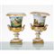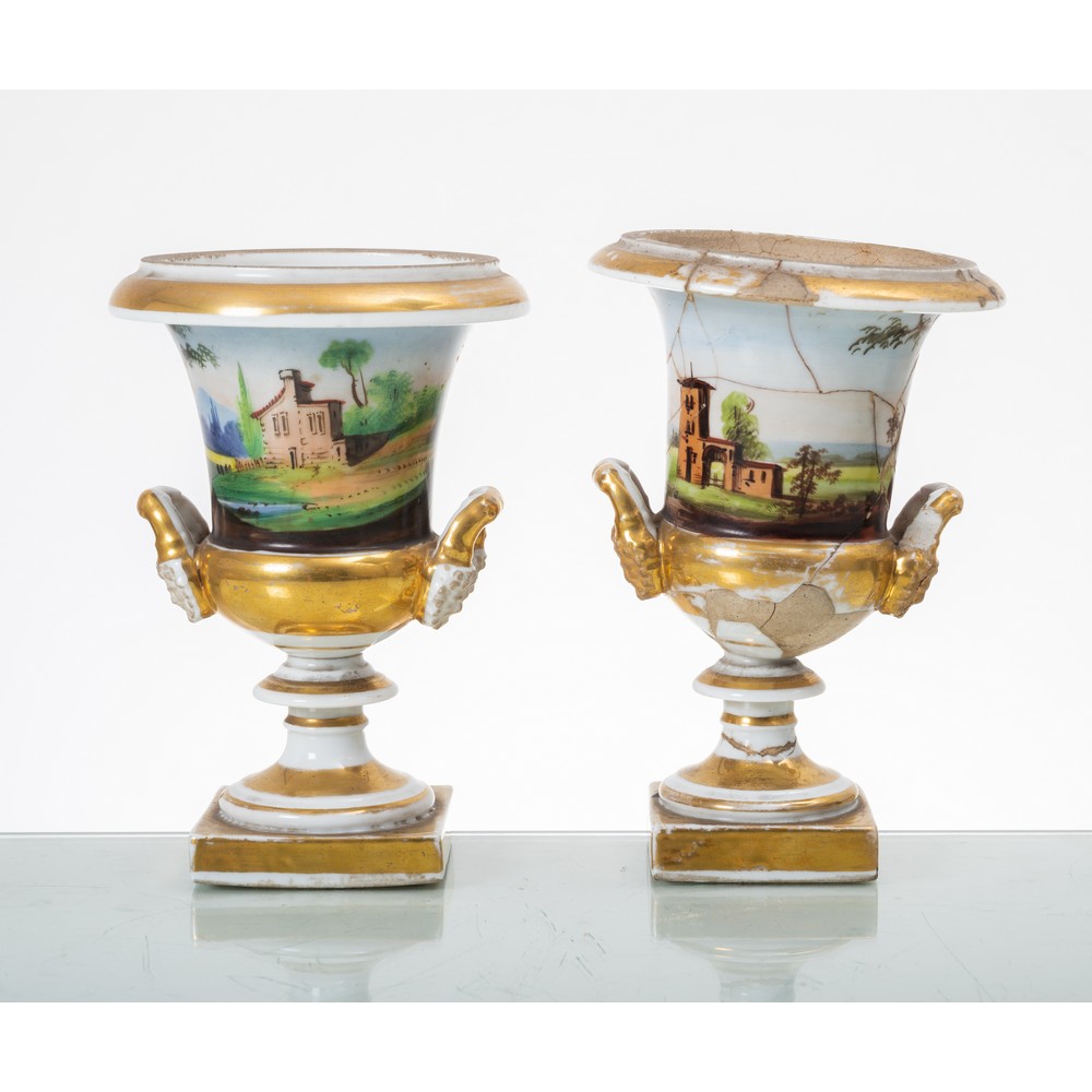Coppia di vasi Impero a cratere in porcellana decorata e dipinta con scene paesaggistiche (rotture e restauri).