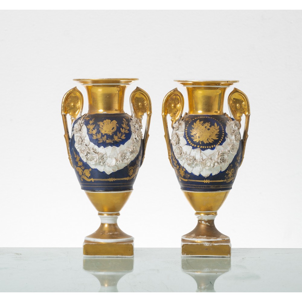 Coppia di piccoli vasi Impero in porcellana decorata e dipinta con lumeggiature in oro (difetti).
