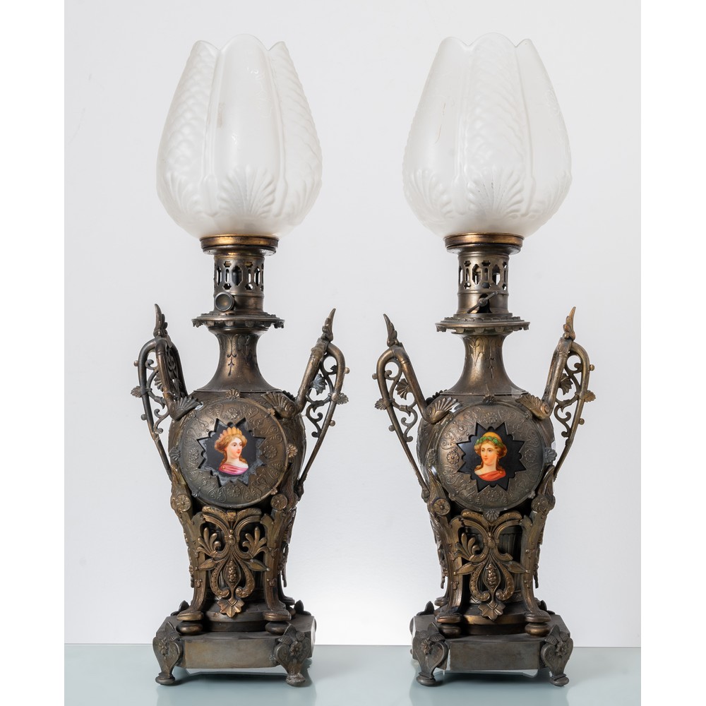 Coppia di lumi in metallo con placche in porcellana e bocce in vetro (rottura ad un manico).