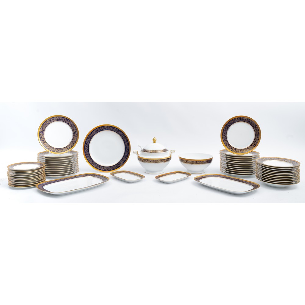 Servizio di piatti in porcellana bianca con decori in oro e blu cobalto composto da: 24 piatti piani, 12 piatti fondi, insalatiera, 12 piatti frutta, piatto da portata tondo, 2 piatti da portata rettangolari, 2 raviere, zuppiera con cucchiaio e salsiera (usure).