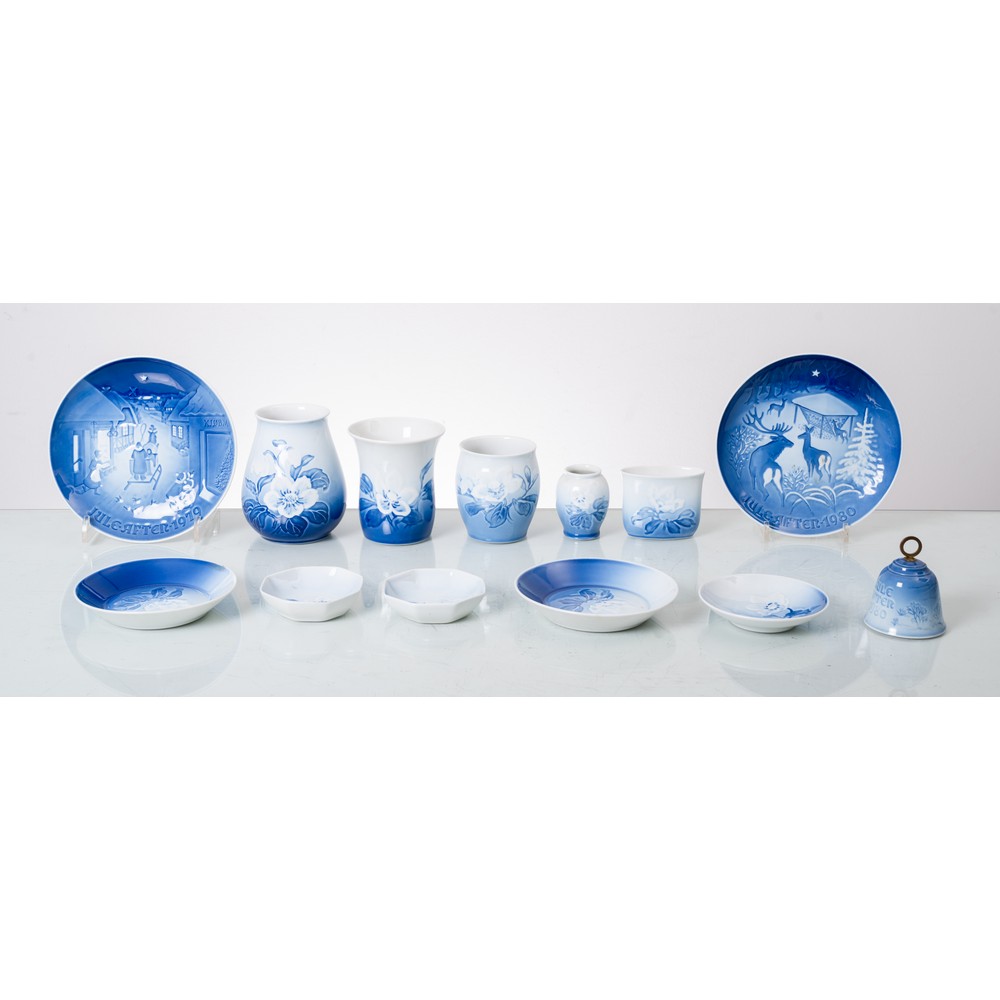 Cinque piccoli vasi, campanella, cinque piattini e due ciotoline in porcellana nei toni del blu.