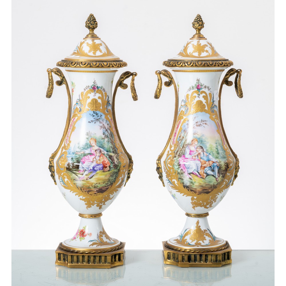 COPPIA DI VASI tipo potiche in porcellana decorata con guarnizioni in bronzo.