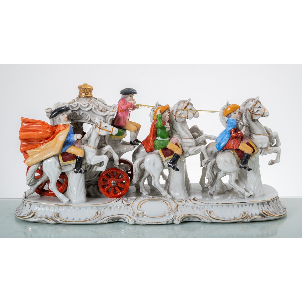 Gruppo in porcellana policroma raffigurante "Carrozza con personaggi e cavalli" con lumeggiature in oro.