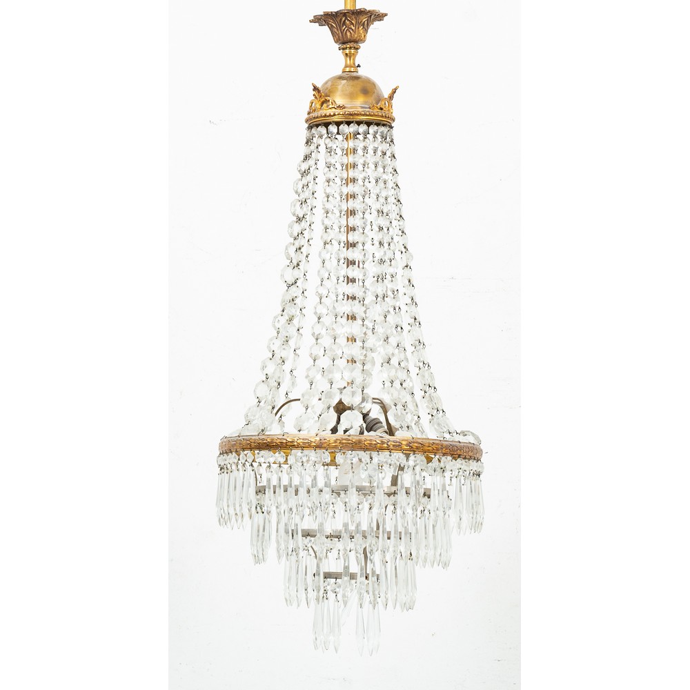 LAMPADARIO a ninfa con struttura in metallo dorato con catene, ottagoni e prismi in vetro.