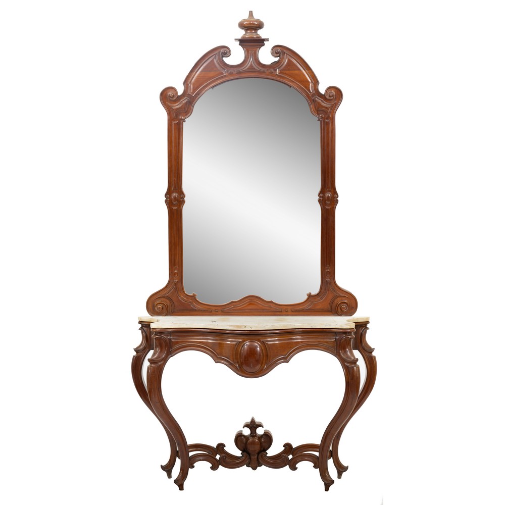 Consolle con specchiera lastronata in legno di noce con piano in marmo bianco di Carrara.
