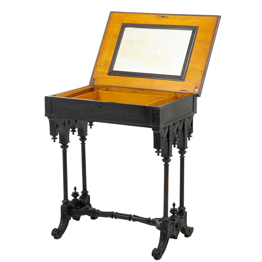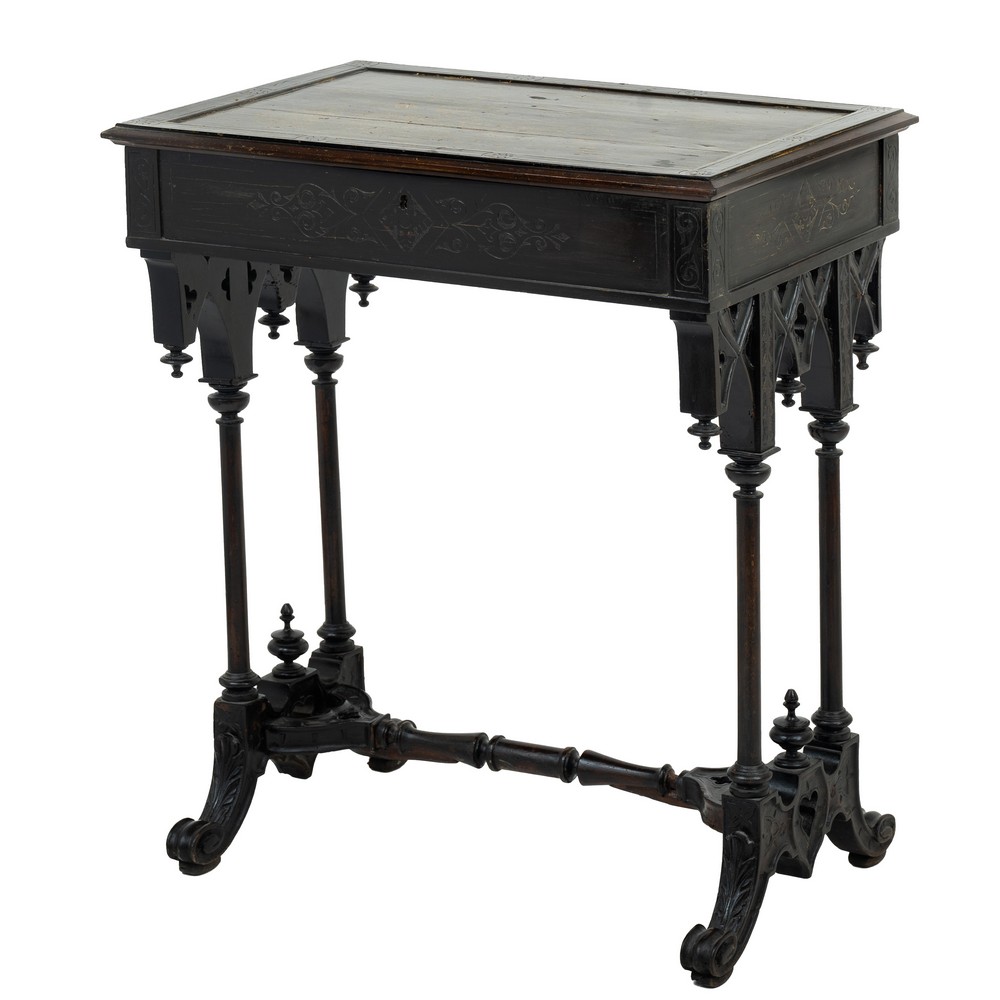 Tavolino da lavoro di gusto neogotico in legno ebanizzato riccamente intagliato.