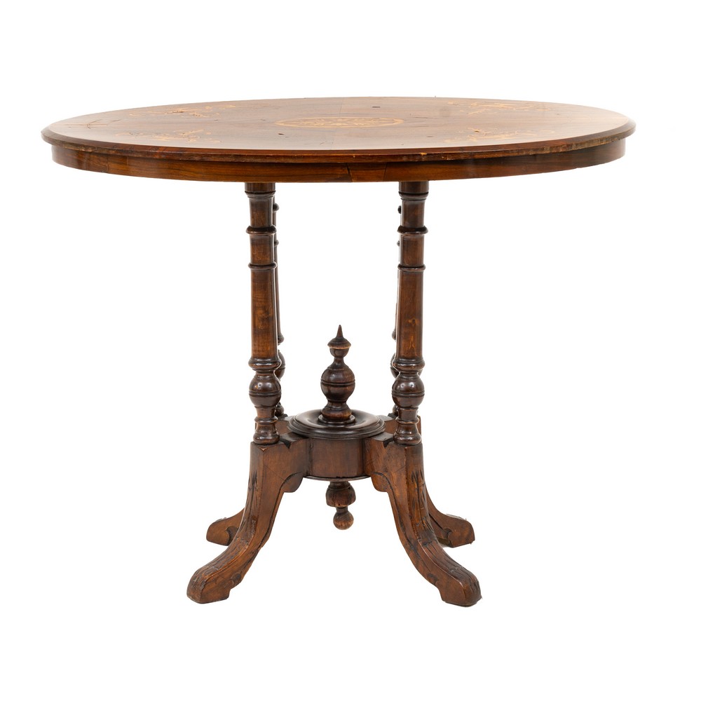 Tavolino in legno di noce di forma ovale, piano intarsiato in legno di bosso.