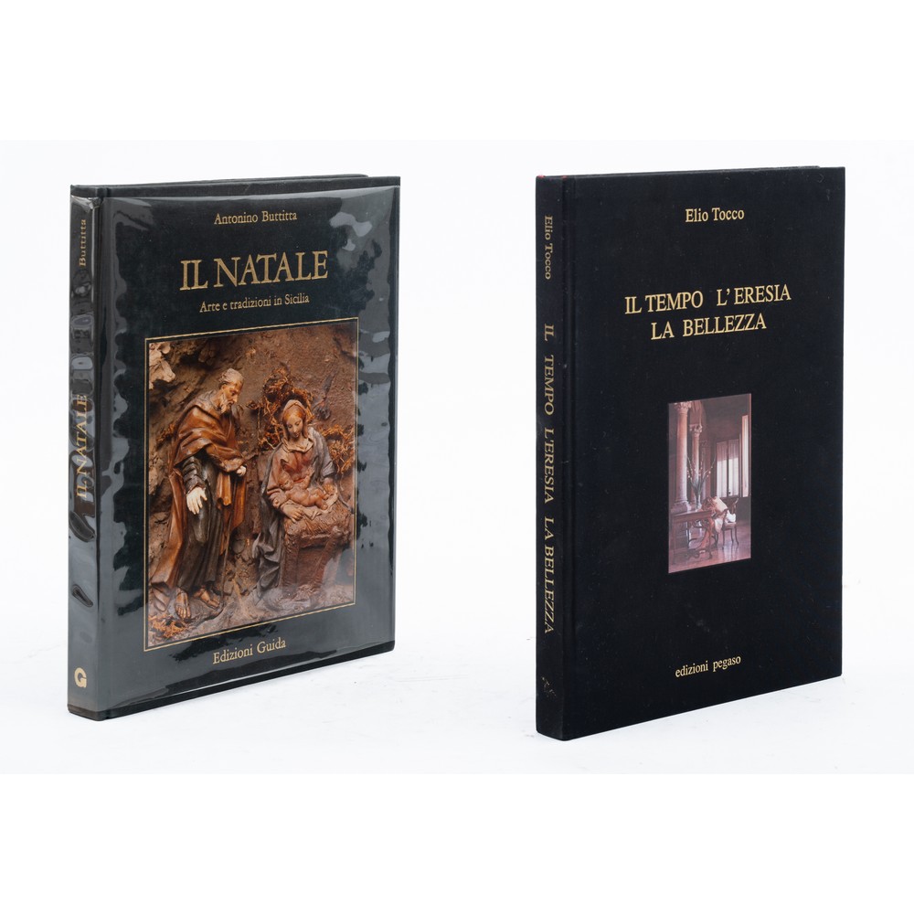 DUE VOLUMI D’ARTE: 1) Elio Tocco IL TEMPO L’ERESIA LA BELLEZZA, ed. Pegaso 1991. Legatura editoriale in tela nera con titoli in oro al piatto e al dorso. Fotoapplicazione al piatto anteriore. L’opera di uno dei più raffinati, profondi e disillusi uomini di cultura siciliani contemporanei. Cm 31 x 24. Pp. 230.2) Antonino Buttitta IL NATALE, ed. Guida 1985. Cm 33 x 25. Legatura editoriale in tela nera con fotoimpressione a colori sul piatto e titoli in oro al piatto e al dorso. Sopraccoperta editoriale trasparente. Note di Vincenzo Consolo, foto di Melo Minnella e Giuseppe Leone. Pp. 259.