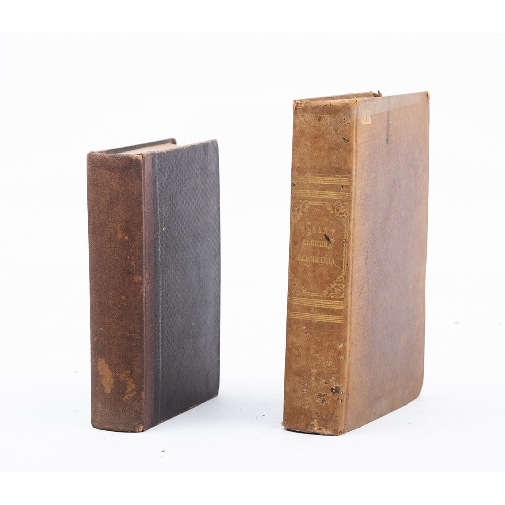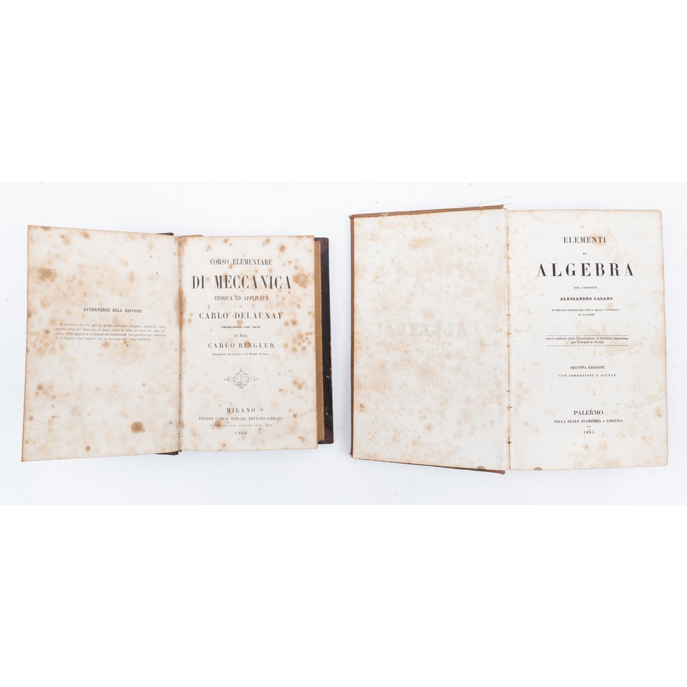 DUE VOLUMI DI VARIA DEL XIX SECOLO: 1) Carlo Delauny CORSO ELEMENTARE DI MECCANICA, ed. Milano, Carlo Turati 1860. Traduzione e note di Carlo Bingler. In 16°. Legatura coeva rigida. Pp. 768. Fioriture sparse ma volume in ottime condizioni. 2) Alessandro Casano ELEMENTI DI ALGEBRA, ed. Palermo, nella Reale Stamperia 1845. In 8°. Legatura in piena percallina rigida. Titoli e filetti in oro al dorso. Tagli spruzzati. Volume in ottime condizioni. Pp. 260 con svariate tavole più volte ripiegate.