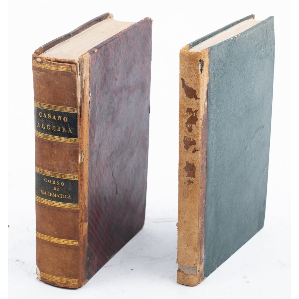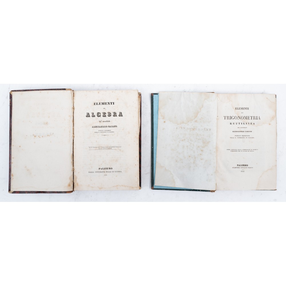 DUE VOLUMI DEL XIX SECOLO DI MATEMATICA: 1) Alessandro Casano ELEMENTI DI ALGEBRA, ed. Palermo, reale tipografia di Guerra 1833, in 8°. Legatura coeva in mezza pelle e piatti marmorizzati. Titoli entro tassello in oro e decori grecati in oro al dorso. Sporadiche fioriture ma volume in ottime condizioni. con due belle tavole f. t. più volte ripiegate. Pp. 625, (8). 2) Alessandro Casano ELEMENTI DI TRIGONOMETRIA RETTILINEA, ed. Palermo, Giovanni Pedone 1841. In 8°. Raro. Legatura coeva in mezza pelle e piatti marmorizzati. Titoli in oro al dorso, ma dorso usurato. Sporadiche gore e fioriture ma volume in ottime condizioni. Con una tavola f. t. più volte ripiegate. Pp. 211, (8).