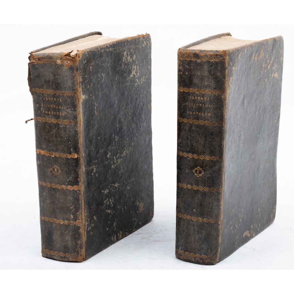DUE VOLUMI DEL DIZIONARIO DI Francesco D’Alberti (abate di Villanova) GRAND DICTIONNAIRE FRANCAIS – ITALIEN. GRAN DIZIONARIO ITALIANO – FRANCESE, Composto su i Dizionarii dell’Accademia di Francia e dell’Accademia della Crusca arricchito di tutti i termini tecnici delle scienze e delle arti. Ed. Napoli, Tipografia del Tasso. 1835. Opera in due volumi. 1^ Ediz. napolitana notabilmente corretta, migliorata ed accresciuta. Due imponenti volumi In 4°. Bella legatura coeva in piena pelle con titoli e fregi impressi in oro ai dorsi. Contiene: Dedica a SAR il Duca di Savoia; Memorie riguardanti l’abate D’Alberti scritte da F. Federighi; Notizie bibliografiche; Prefazione; Indici degli autori e delle opere da cui si trassero le voci adottate; Regole grammaticali; Pronuncia italiana e francese; Tavola delle abbreviature. Testo su tre colonne. Note e glosse m. s. all’inizio dei volumi. Pp. XXXII, 999; XXXII, 1028 con leggere fioriture.
