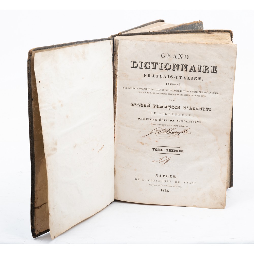 DUE VOLUMI DEL DIZIONARIO DI Francesco D’Alberti (abate di Villanova) GRAND DICTIONNAIRE FRANCAIS – ITALIEN. GRAN DIZIONARIO ITALIANO – FRANCESE, Composto su i Dizionarii dell’Accademia di Francia e dell’Accademia della Crusca arricchito di tutti i termini tecnici delle scienze e delle arti. Ed. Napoli, Tipografia del Tasso. 1835. Opera in due volumi. 1^ Ediz. napolitana notabilmente corretta, migliorata ed accresciuta. Due imponenti volumi In 4°. Bella legatura coeva in piena pelle con titoli e fregi impressi in oro ai dorsi. Contiene: Dedica a SAR il Duca di Savoia; Memorie riguardanti l’abate D’Alberti scritte da F. Federighi; Notizie bibliografiche; Prefazione; Indici degli autori e delle opere da cui si trassero le voci adottate; Regole grammaticali; Pronuncia italiana e francese; Tavola delle abbreviature. Testo su tre colonne. Note e glosse m. s. all’inizio dei volumi. Pp. XXXII, 999; XXXII, 1028 con leggere fioriture.