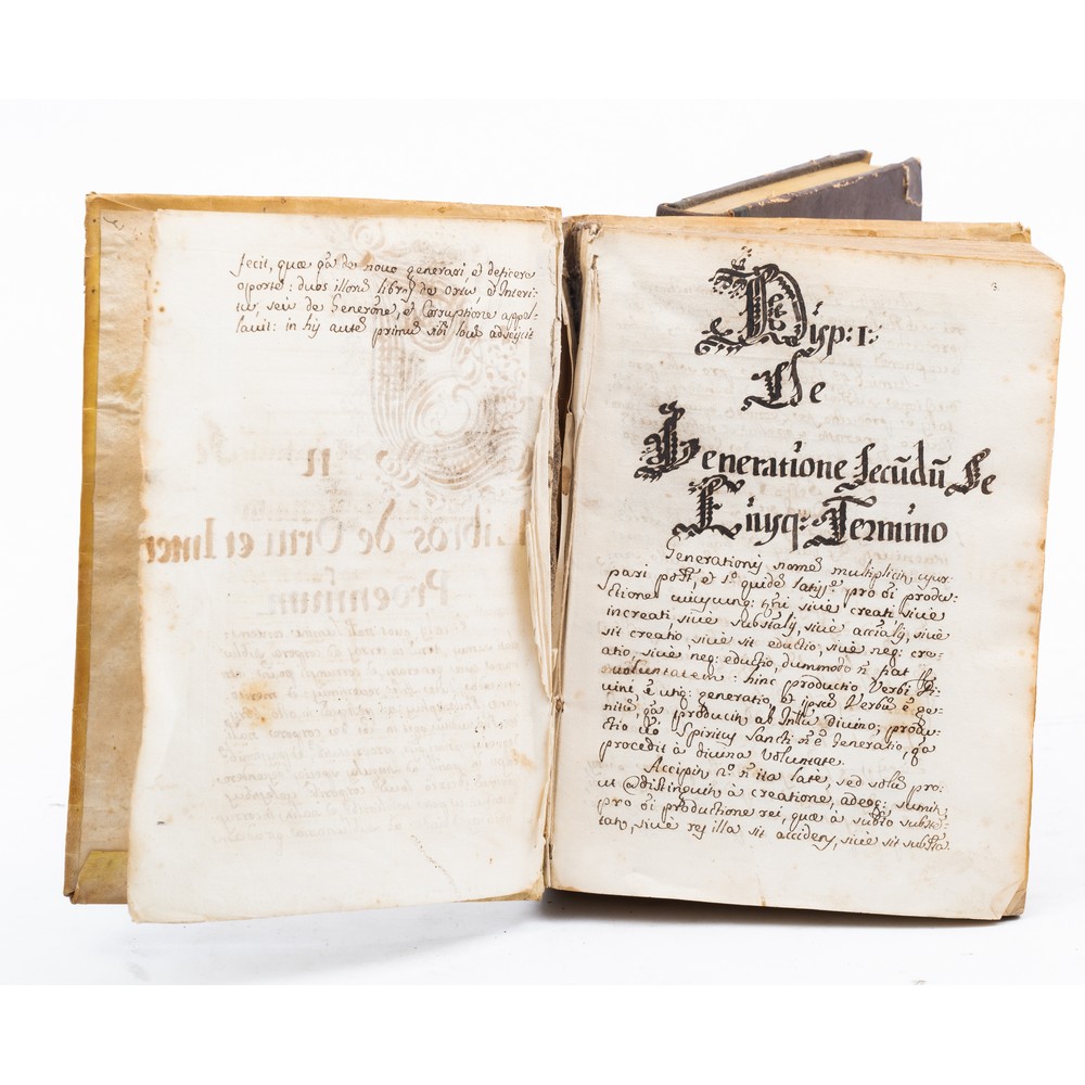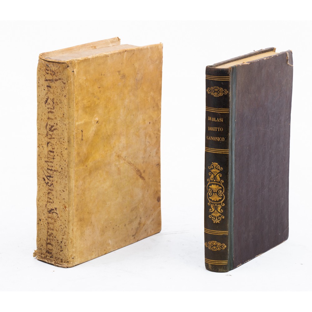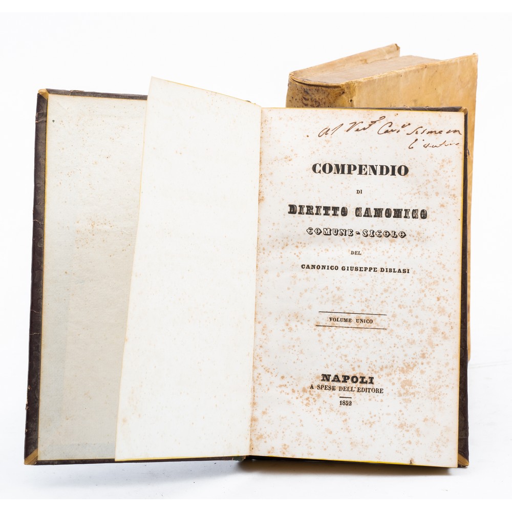 DUE VOLUMI DEL CANONICO GIUSEPPE DI BLASI: 1) Canonico Giuseppe Diblasi -COMPENDIO DI DIRITTO CANONICO COMUNE – SICOLO , ed. Napoli a spese dell’Editore, 1852. 1^ edizione. In 8° antico. Legatura in mezza pelle con titoli, flletti e fregi in oro al dorso. Piatti damascati fiorati. Tagli colorati. Sporadiche fioriture. Opera in ottime condizioni. Pp. 2, 314. 2) VOLUME MANOSCRITTO, di mano anonima, del XVIII secolo contenente trascrizioni di studio e appartenuto al Canonico Giuseppe Di Blasi, autore del precedente volume sopra descritto. Ex libris del Canonico Di Blasi al frontespizio. Il volume contiene le copie manoscritte delle opere De Ortu et Interitu e De Generatioe et Corruptione di Aristotele. Il De generatione et corruptione - dal titolo latino con cui è conosciuto - è un'opera di Aristotele, in due libri, collocata dagli editori, in conformità con le indicazioni dell'autore, al terzo posto nella serie degli scritti fisici, tra il De Caelo e i Meteorologica. Il De Ortu et Interitu è copiato dal De ortu et interitu libri duo, Ioachimo Perionio interprete per Nicolaum Grouchium correcti & emendati, pubblicato nel 1552 ex officina Michaelis Vascosani, uia Iacobea ad insigne Fontis. Legatura coeva in piena pergamena e titoli m. s. al dorso. Il manoscritto è in perfette condizioni. Pagine numerate a mano. In fine allegato alla legatura le ASSENRTIONES PHILOSOPHICAE PUBLICE PROPUGNANDE A D. BALTHASSARE CARUSO PANORMITANO, edito a Palermo nel 1709 per i tipi di Francesco Cichè e rarissimo a trovarsi.