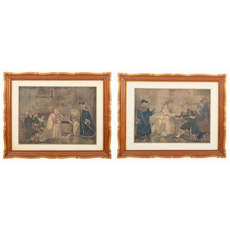 Coppia di incisioni a colori raffiguranti "Interni con figure".