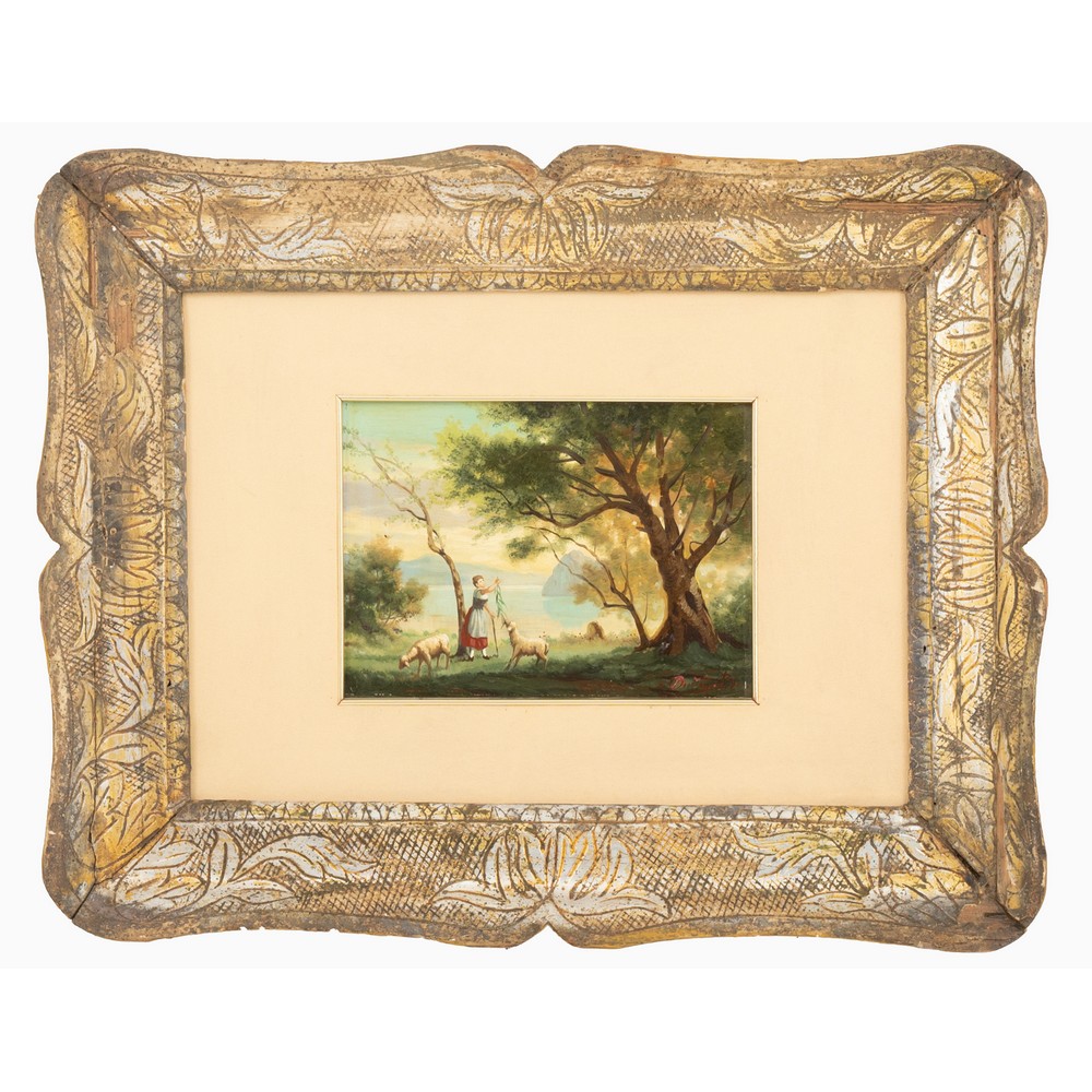Cornice a guantiera con doratura in argento e mistura con all'interno olio su masonite del XX secolo raffigurante "Paesaggio campestre con personaggi".