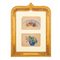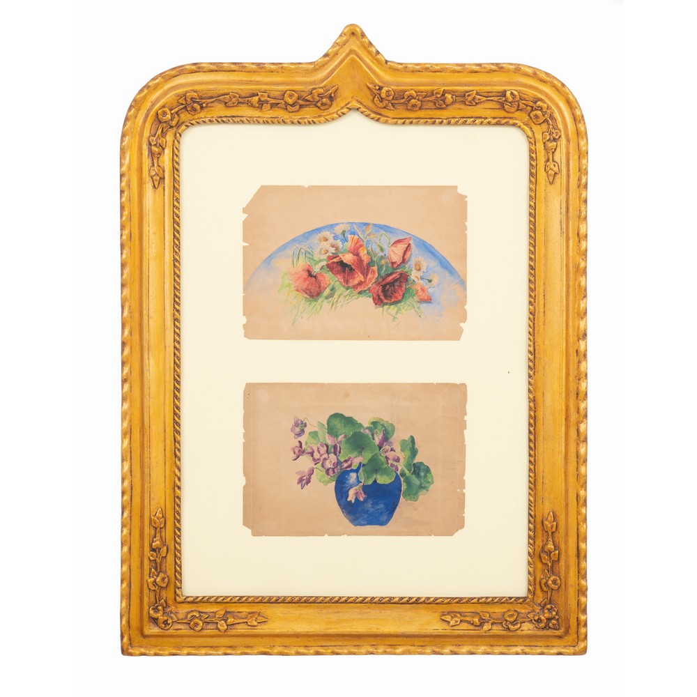Cornice a punta in legno dorato ad argento e mistura con all'interno due acquarelli su carta raffiguranti "Fiori".