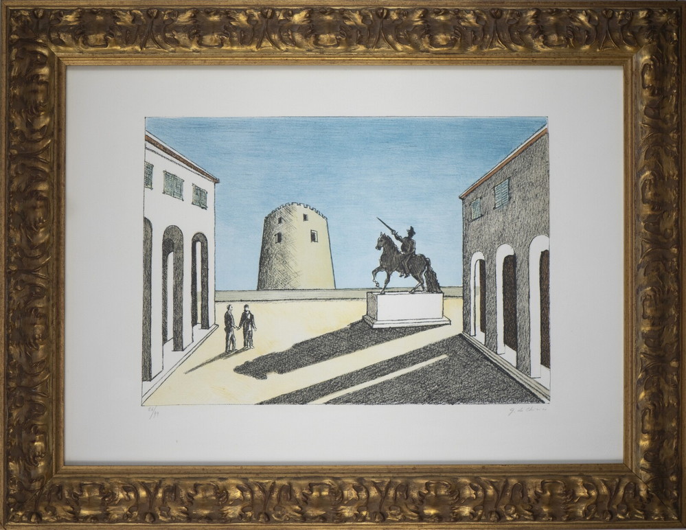 DE CHIRICO GIORGIO (1888 - 1978) PIAZZA D' ITALIA CON STATA ECQUESTRE. 1973. Litografia a 5 colori. Cm 70,00 x 50,50. firma e tiratura a matita, es.26/99