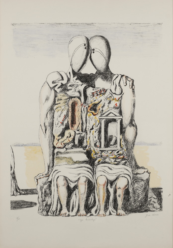 DE CHIRICO GIORGIO (1888 - 1978) GLI ARCHEOLOGI. Litografia a colori. Cm 70,00 x 100,00. firma, titolo e tiratura a matita, es B/Z