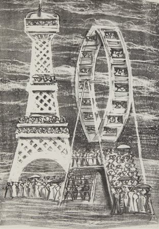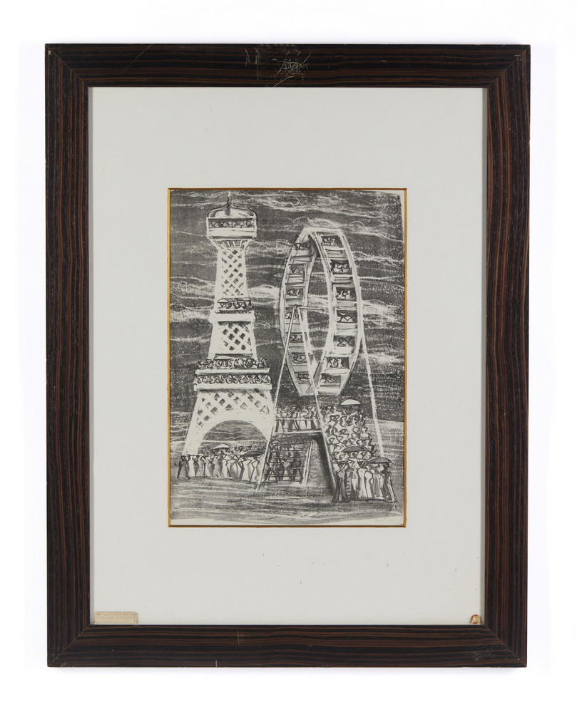 Di questa litografia, a differenza di quanto accade per le altre dello stesso Campigli, la tiratura è molto limitata. Secondo Meloni/Tavola ne sono noti solo quattro esemplari: tre prove a colori firmate e datate, una della quali, pastellata in rosso, è nota pure una prova in bianco e nero non firmata. Oltre a queste quattro prove e siste una prova parziale in bianco e nero, conservata nel lascito di Campigli, che non rientra nel novero della tiratura. L'opera qui in esama risulta essere il quinto esemplare ad oggi noto del motivo parigino, tre dei cinque esemplari sono stampati a colori e due sono in bianco e nero. Cornice presente