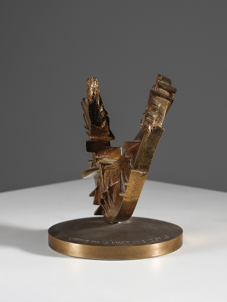 POMODORO ARNALDO (n. 1926) ROTAZIONE ASCENSIONALE I (PER GRUPPO IRI). 1993. Scultura in bronzo fuso a cera persa. Cm 10,00 x 16,50 x 10,00. incise alla base: firma, data, dedica ad personam, es. 15/70