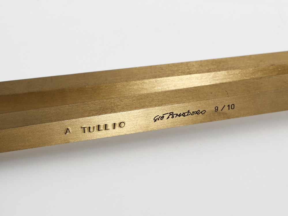 POMODORO GIO' (1930 - 2002) COMPASSO. Bronzo dorato. Cm 5,00 x 54,50 x 1,50. firma, tiratura e dedica ad personam incise, es 9/10