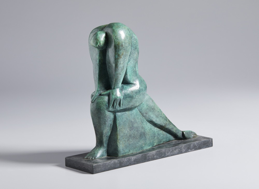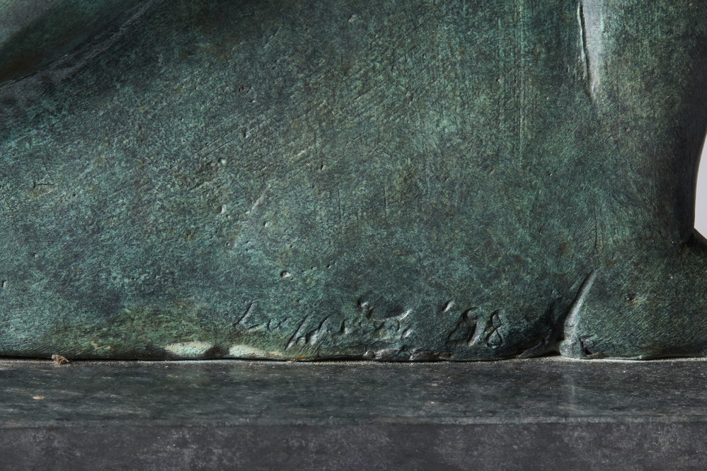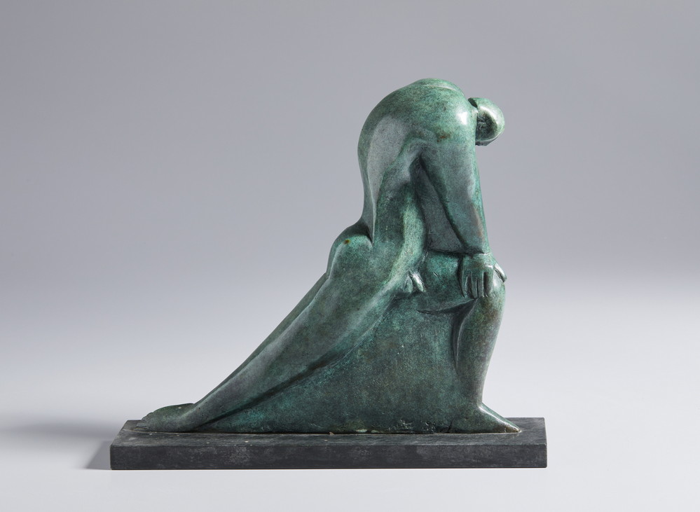 LUPPINO SUSAN (n. 1945) UOMO IN GINOCCHIO. 1998. Multiplo in bronzo a patina verde. Cm 30,00 x 28,00 x 8,00. firma, data e tiratura incise alla base, es. 1/3 p.a