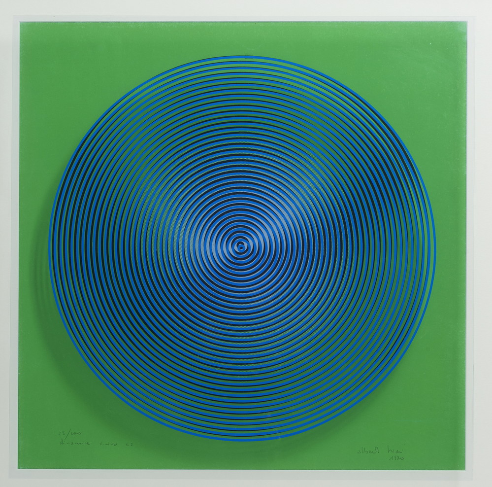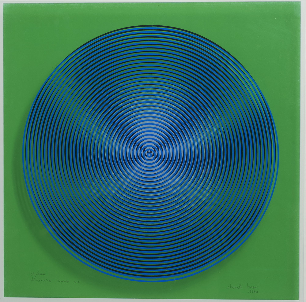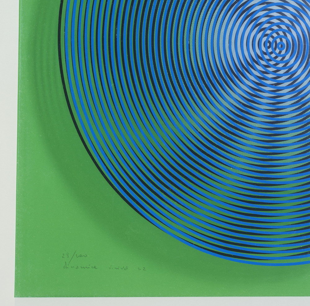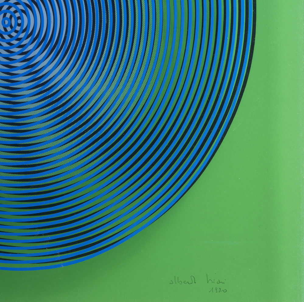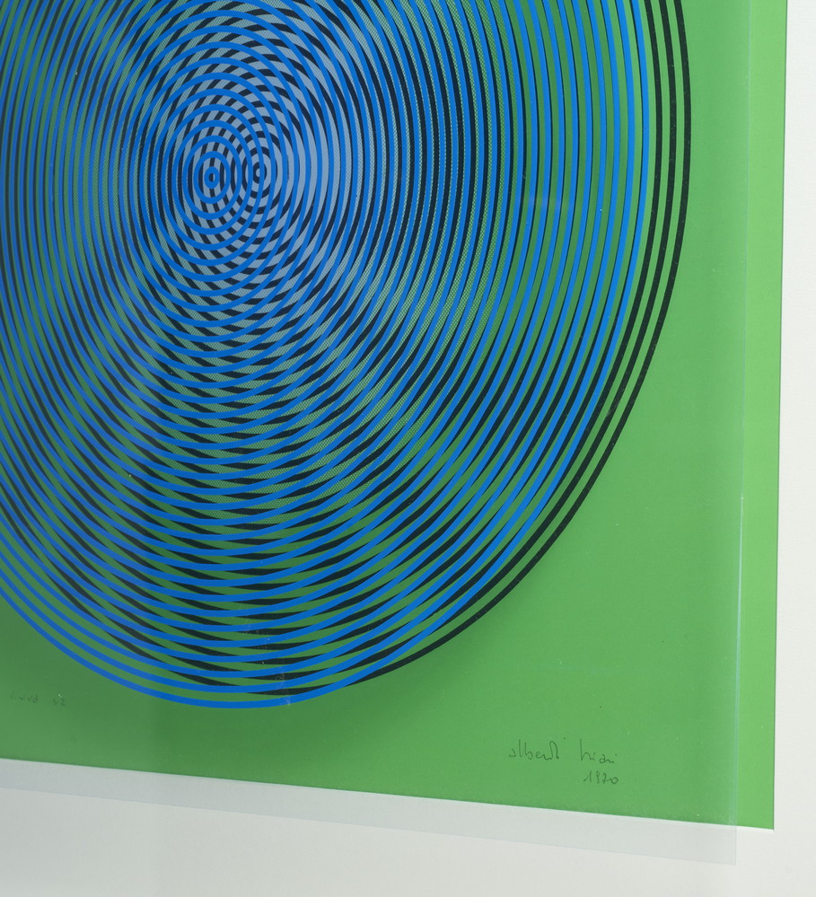 Foglio proveniente da una cartella contenente cinque serigrafie cinetiche di Alberto Biasi: progetto S1, dinamica visiva in verde su fondo rosso, doppia serigrafia su cartoncino mat e su acetato trasparente. Progetto S2, dinamica visiva in azzurro e nero su verde sfumato bianco, doppia serigrafia su cartoncino mat e su acetato trasparente. Progetto S3, interferenza rosso e giallo su Sfondo grigio, serigrafia su cartoncino mat. Progetto S4, trasparenza cinetica in blu su fondo grigio chiaro, doppia serigrafia su cartoncino mat e su acetato trasparente. Progetto S5, rilievo 4 in blu e giallo su fondo verde, doppia serigrafia su cartoncino mat sovrapposti, cartoncino superiore fustellato a zig zag con tagli corti verticali per l'incastro.