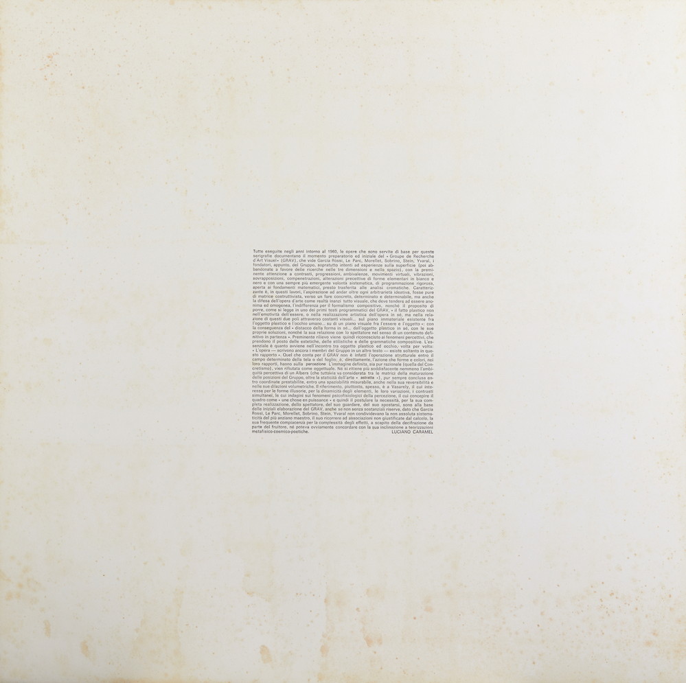 Cartella realizzata in occasione della mostra retrospettiva, Lago di Como, 20/30 settembre 1975 a cura di Luciano Caramel del Groupe de Recherche d'Art Visuel ( Garcia Rossi, Le Parc, Morellet, Sobrino, Stein, Yvaral).