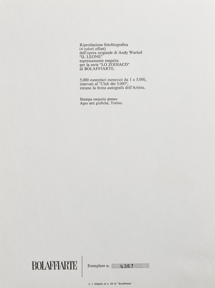 WARHOL ANDY (1928 - 1987) LION. Serigrafia. Cm 21,00 x 28,00. firma a matita, es. 4367/5000