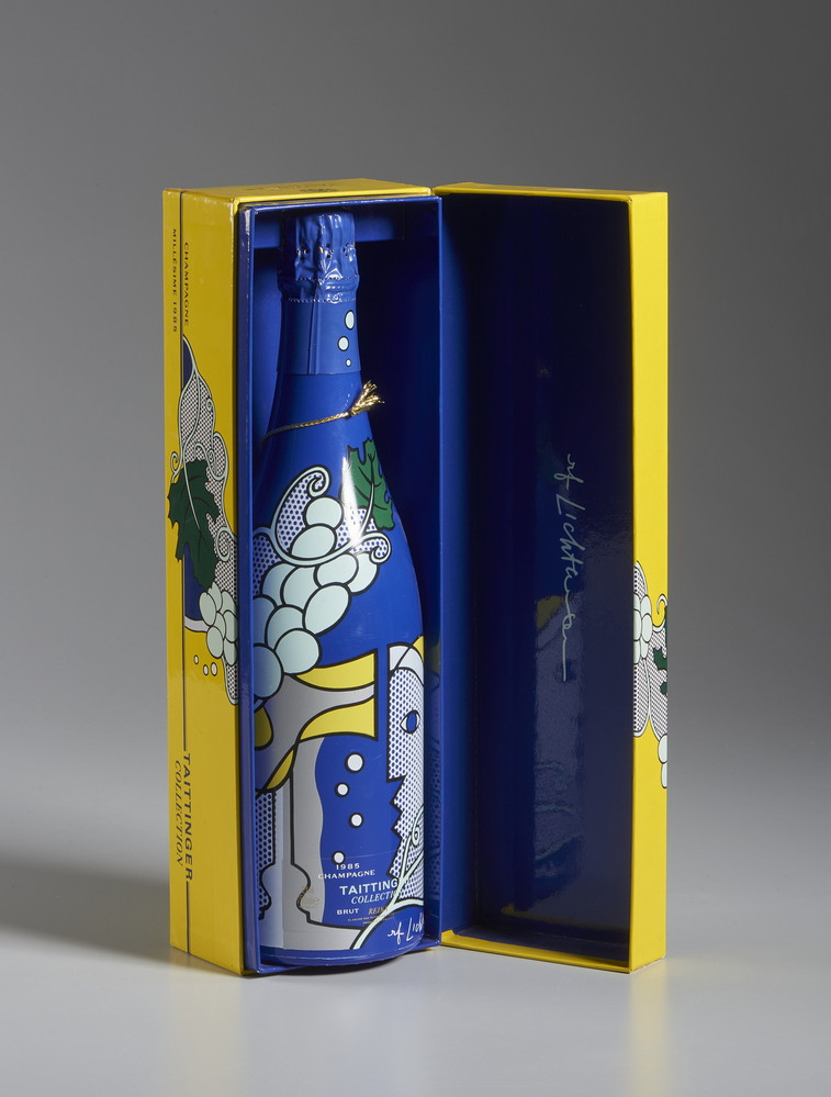 LICHTENSTEIN ROY (1923 - 1997) ROY LICHTENSTEIN PER TAITTINGER COLLECTION. Multiplo. Cm 35,00 x 10,50 x 10,50. firma dell'autore serigrafata sul fondo della bottiglia e sulla custodia.