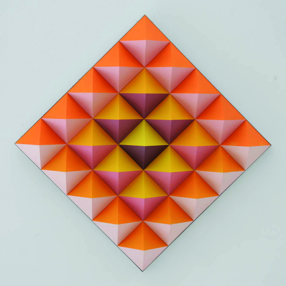 HANS JORG GLATTFELDER (1939) - " PYR - 173 ", 1970, Rilievi con piramidi, cm. 50 x 50 x 10. Firmato e datato sul retro. Dedica dell'artista sul retro. Prov. Collezione Privata