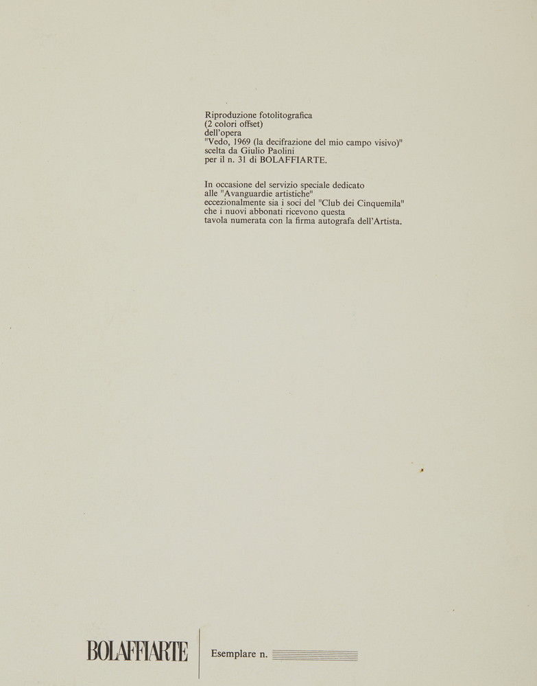 PAOLINI GIULIO (n. 1940) VEDO (LA DECIFRAZIONE DEL MIO CAMPO VISIVO). 1969. fotolitografia. Cm 23,30 x 29,60. firma, data e dedica a Lucio Amelio a matita