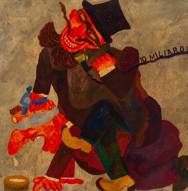 Franz Borghese (Roma 1941 - 2005) PHANTOMAS KIDNAPPING Olio su tela, cm. 50x50 Firmato in basso a destra. Sul verso: firma e titolo; Timbro "Galleria d'Arte Il Gianicolo", Perugia; Timbro "Galleria d'Arte Lo Spazio", Napoli.