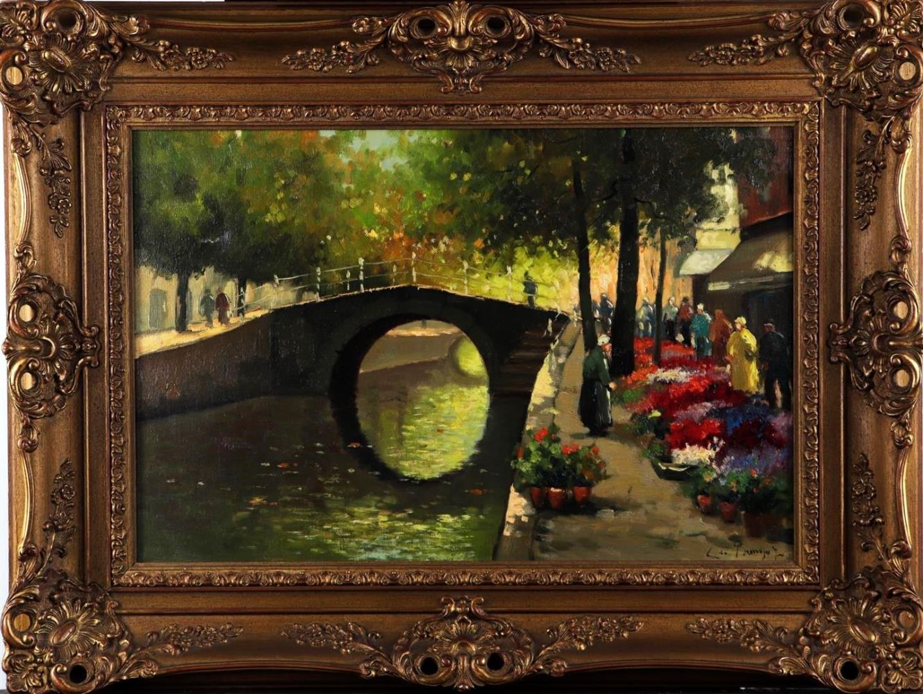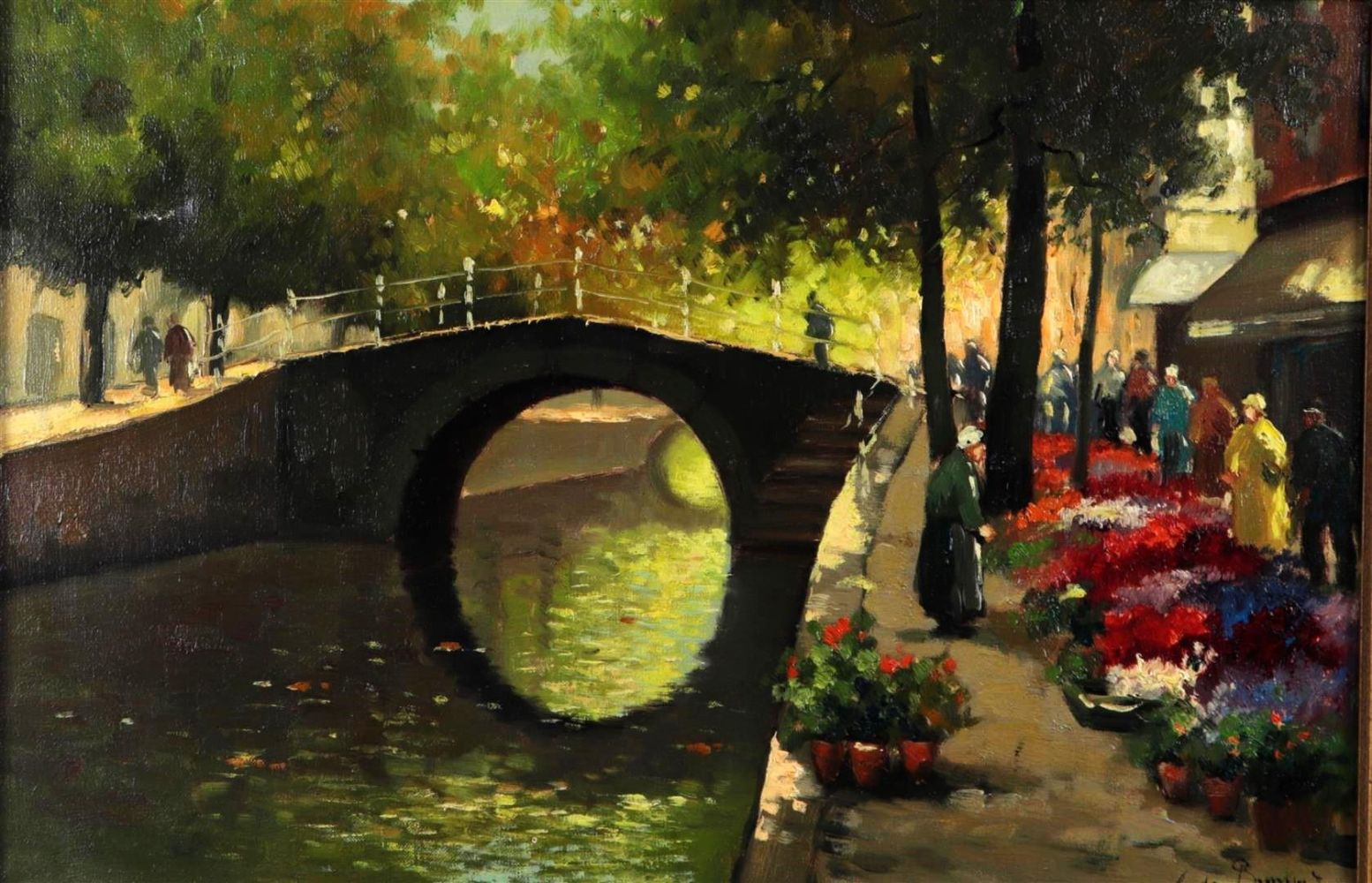 Cornelis de Bruin, Flower Market in Delft, signed (bottom right), oil on canvas - minor damage to the canvas