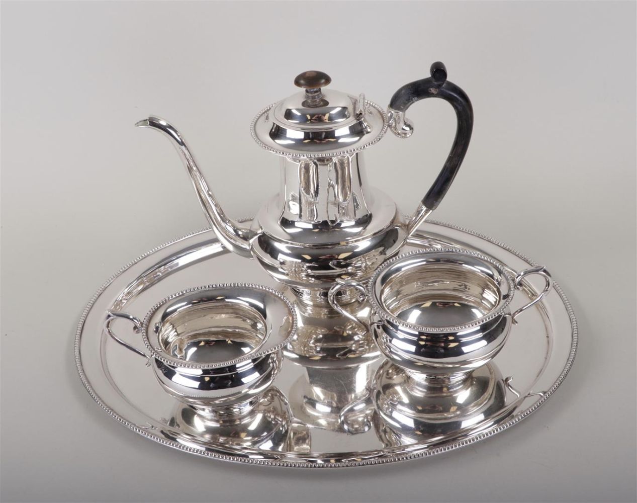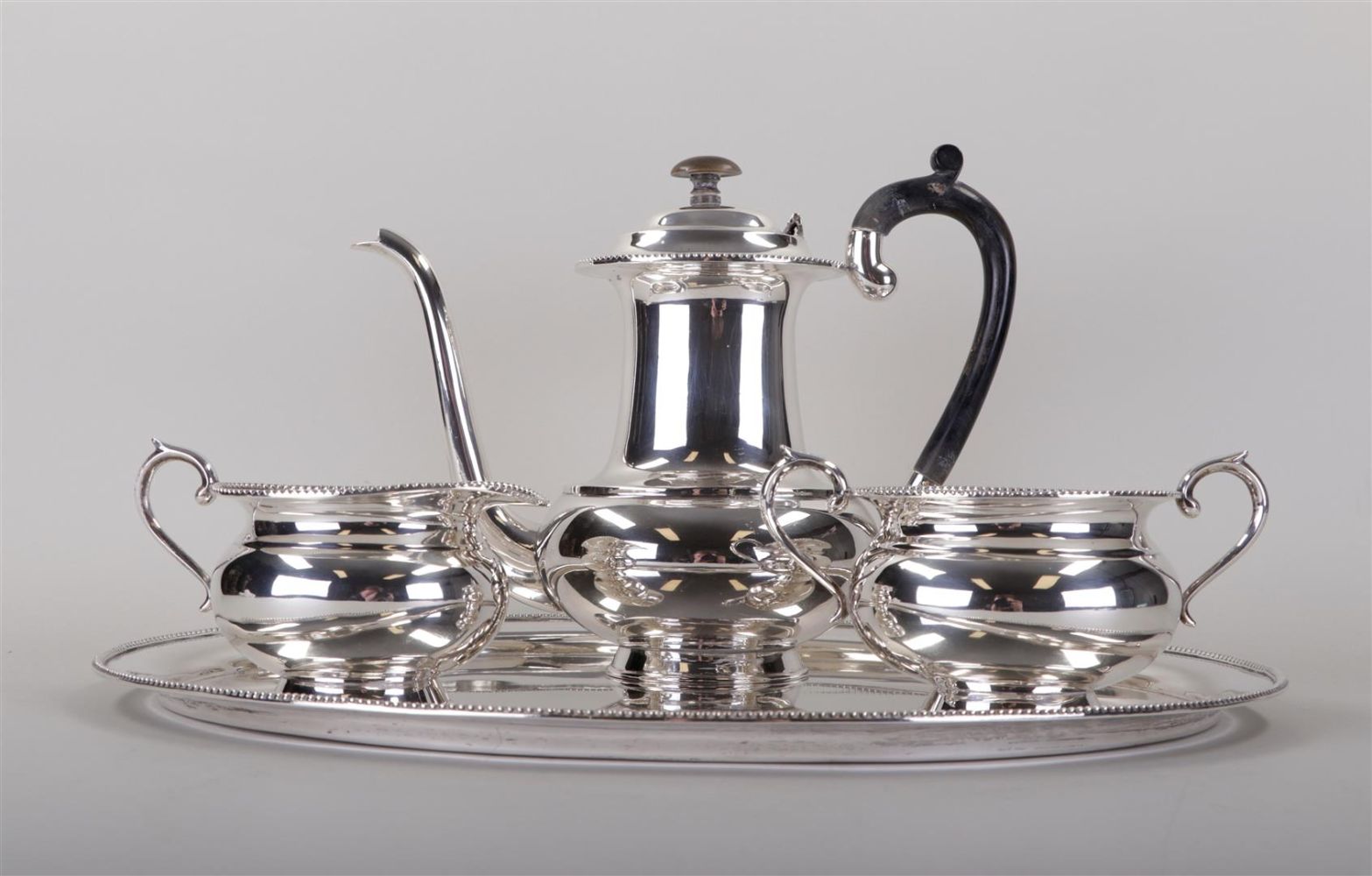 A sterling silver coffee/tea set consisting of a tray, a cream set and a...