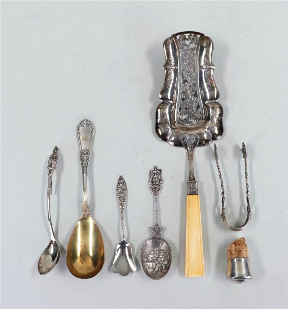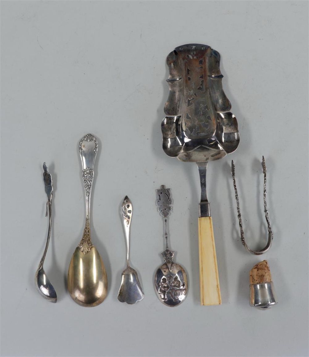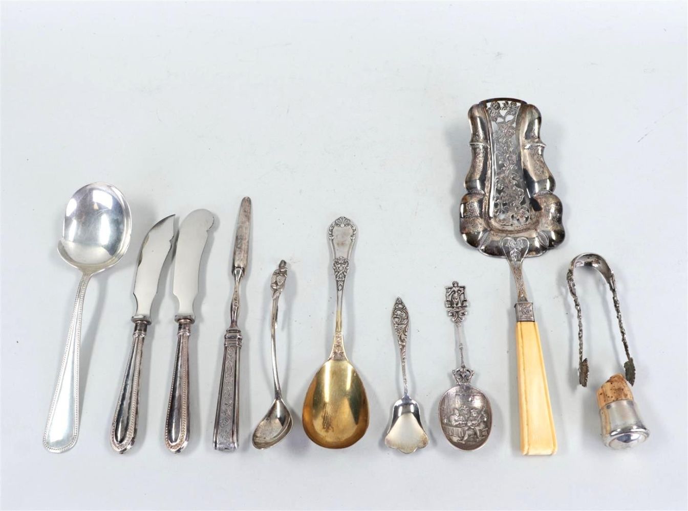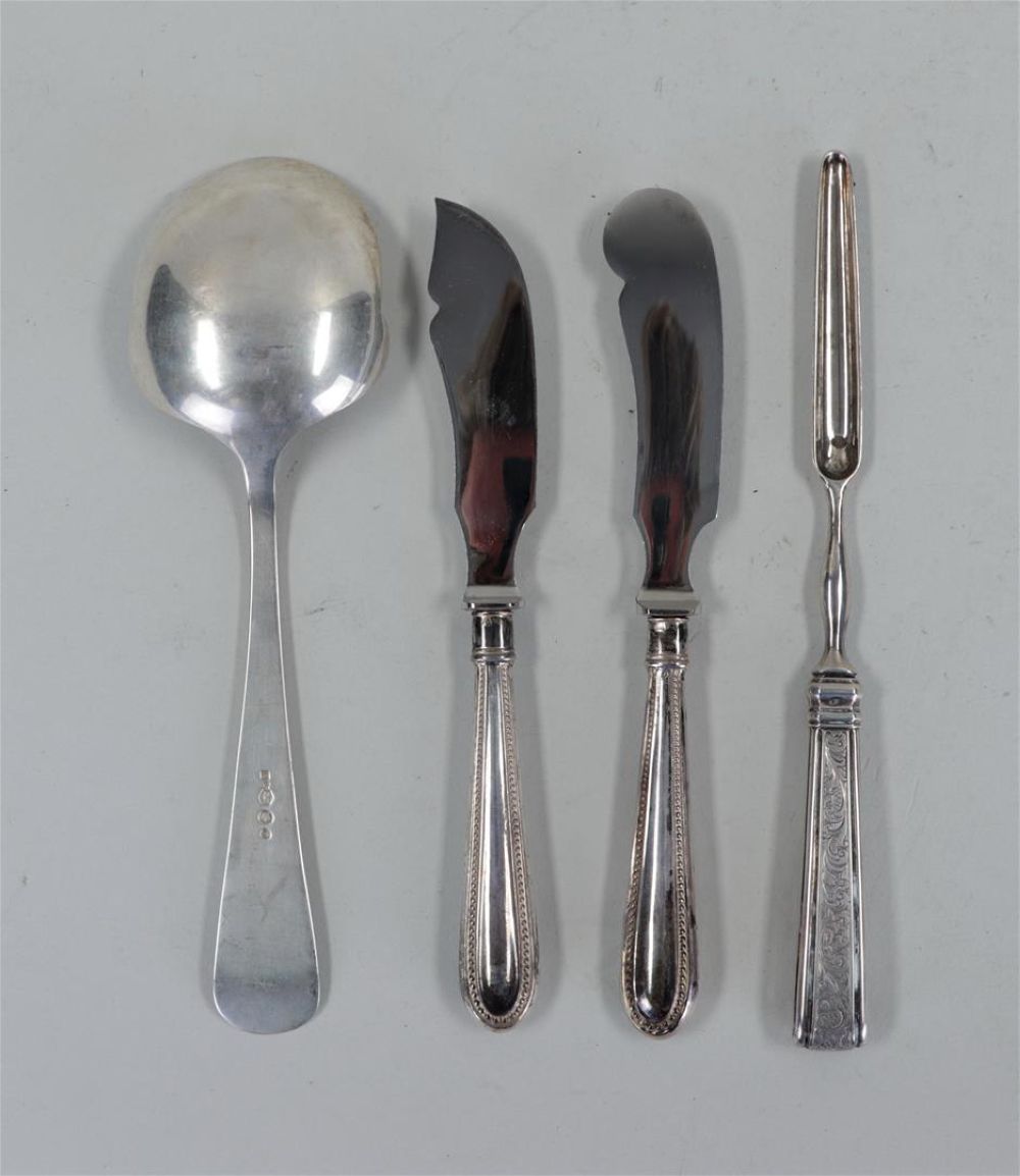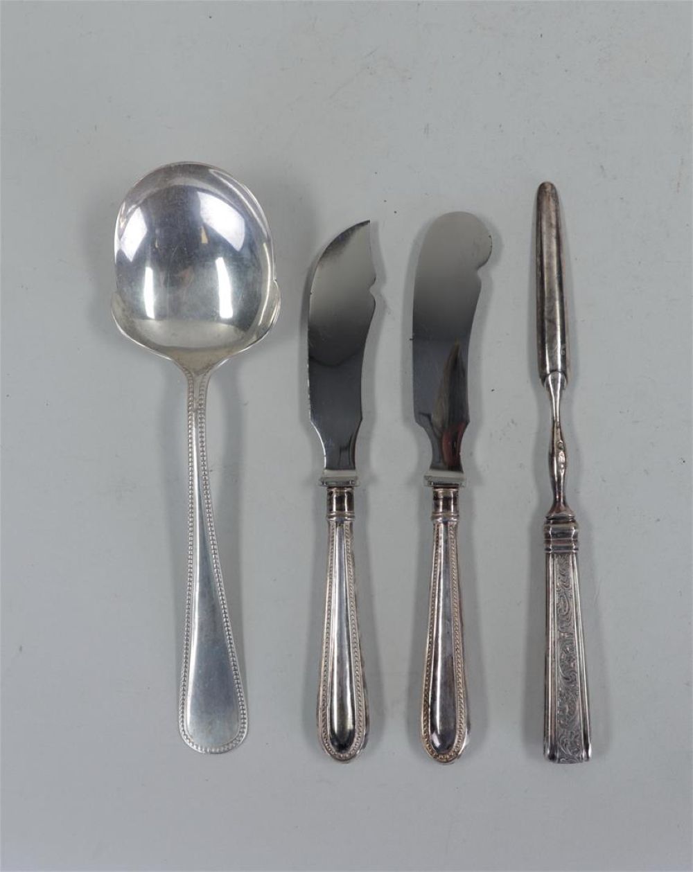 A lot of various silver objects consisting of a fish scoop, marrowbone and...